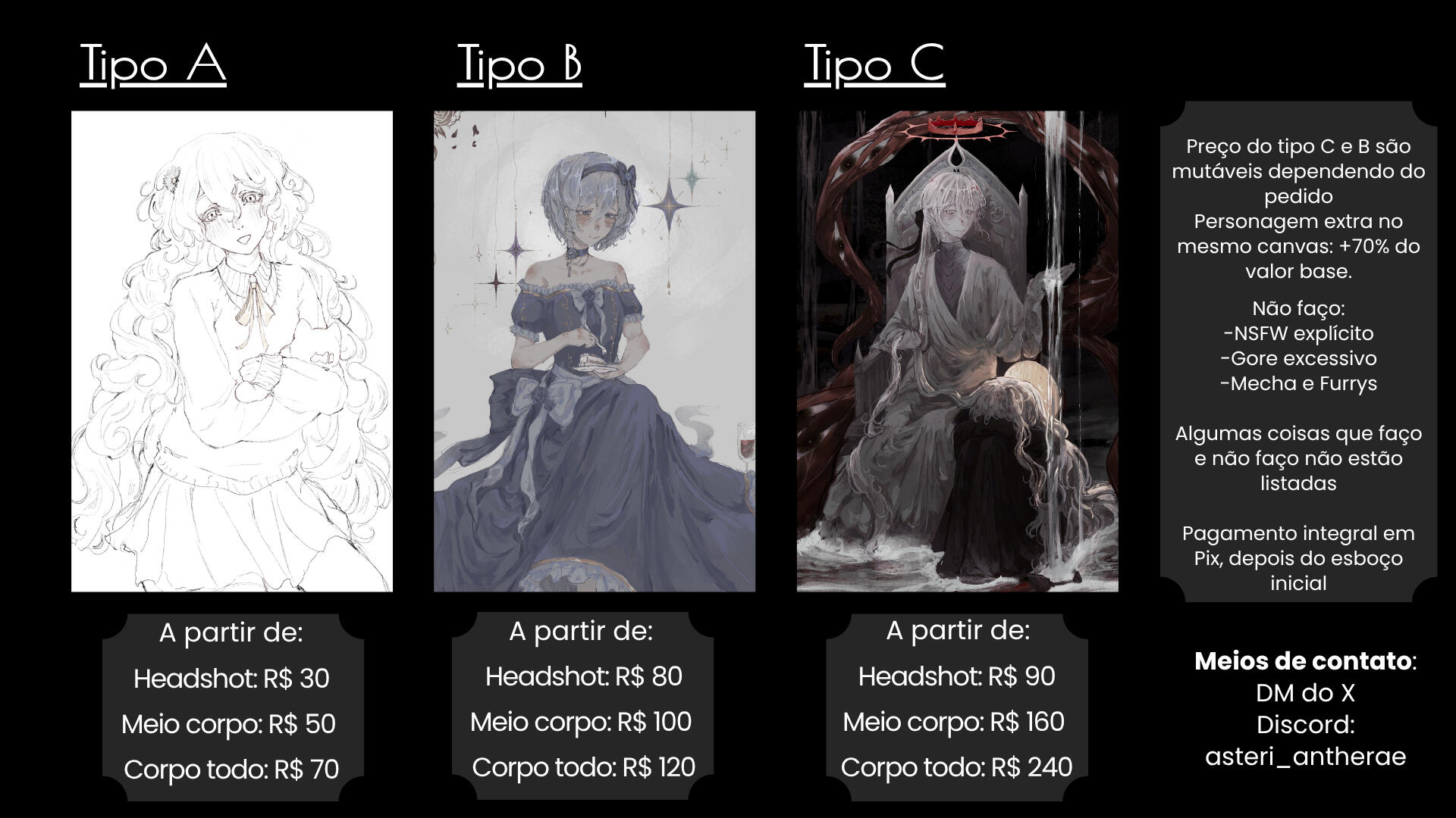 Tipo A: consiste em ilustração com lineart predominante, sem pintura ou com pintura extremamente basica (apenas cores de destaque, ex: cor de olhos, detalhes, mechas).Tipo B: ilustração renderizada com iluminação simples, pode ter fundo colorido e simples com algumas props e detalhes (como do exemplo).Tipo C: Ilustração complexa, iluminação adaptada ao fundo, fundo detalhado, storytelling mais elaborada e composição mais trabalhosa no geral. (A ilustração do exemplo foi trabalhada em mais de 5 dias, a complexidade e tempo fazem do tipo C bem mais caro)Personagem extra no mesmo canvas: +70% do valor base.
